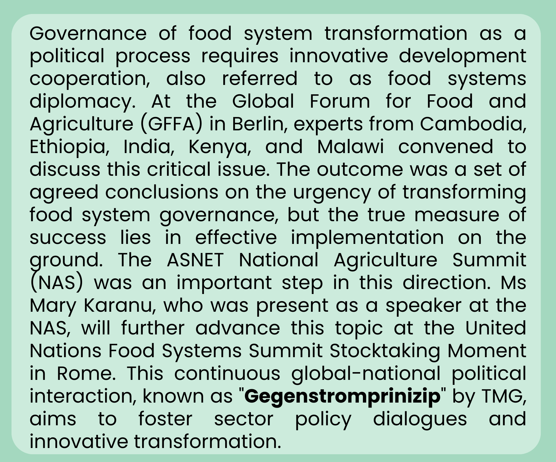 While the food systems conversation continues to take root in Kenya, the level of engagement between different stakeholders particularly the private sector and civil society is still low. However, respective discussion between Kenyan stakeholders starts taking place although not necessary in Kenya itself. During the 2023 Global Forum for Food and Agriculture (the biggest global meeting of agricultural ministers), for example, the German Think Tank TMG Research together with GIZ, Welthungerhilfe and other partners realized a side event with Kenyan representatives to discuss the role of governance in food systems transformation. The side event was attended by ASNET, KENAFF and PELUM (Participatory Ecological Land Use Management), a network of NGOs working with small-scale farmers. One of the main conclusions of the event was the need to have all the different stakeholders on board to ensure sustainable, inclusive transformation of food systems in Kenya.