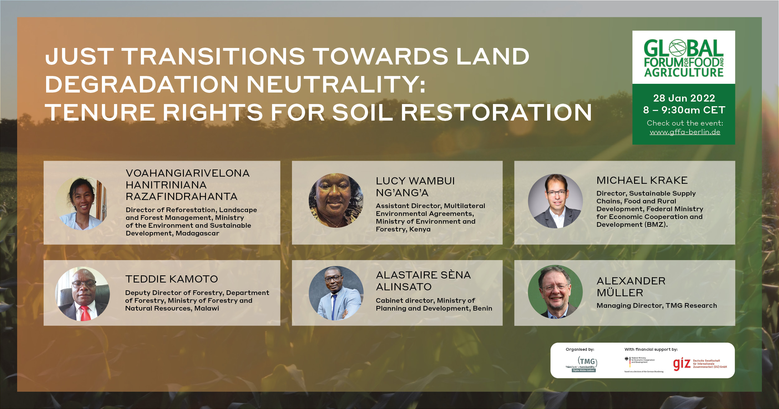 Our preliminary analysis of restoration approaches in four African countries reveals just how intricate the links are between land rights, food security, rural livelihoods, and resilience to climate change. While large-scale soil and land restoration efforts are critical in climate change adaptation, they do not always consider immediate livelihood needs, let alone the legitimate tenure rights of affected communities. How to embrace this complexity was therefore one of the central questions addressed by this expert panel on the last day of this year’s Global Forum for Food and Agriculture (GFFA). The event was convened by TMG Research and four partner institutions from Kenya, Malawi, Benin and Madagascar.