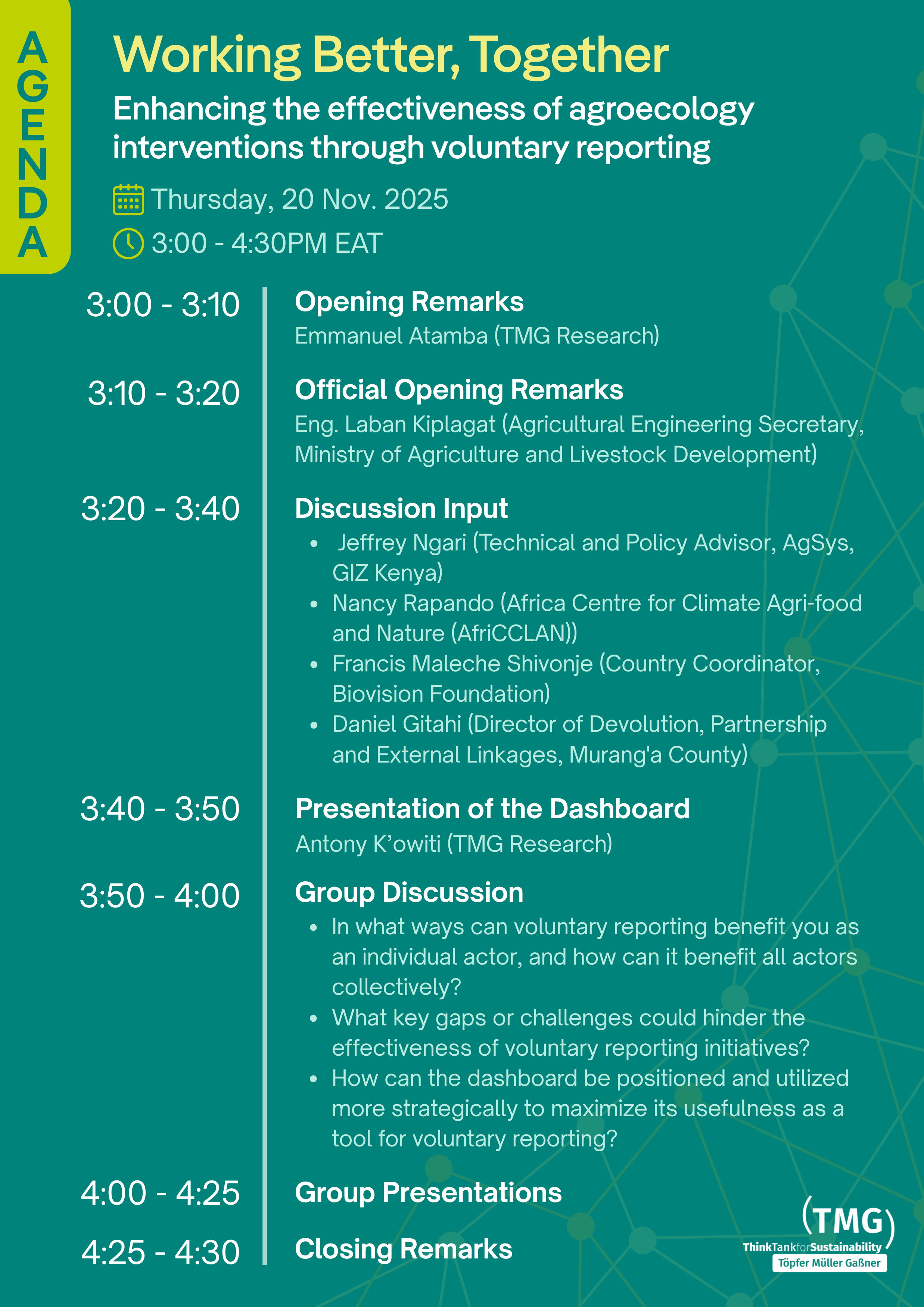 We warmly invite you to join us for a webinar on Thursday, 20th November 2025 at 3:00 - 4:30PM (EAT), where we will delve into the transformational potential of the Kenya Agroecology Actor Dashboard. This session will bring together stakeholders for an important discussion on how the Dashboard can strengthen collective impact, foster accountability and visibility, and build a more connected and impactful agroecology community through voluntary reporting.