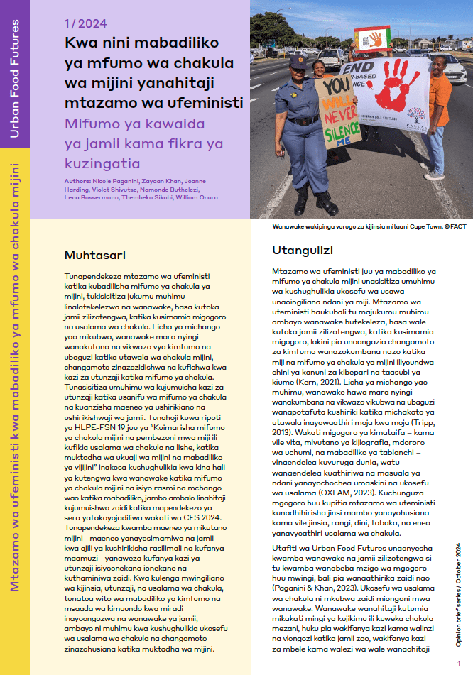 Eli phepha likhuthaza ukuguqulwa kweenkqubo zokutya zasezidolophini ngokuqaphela indima ebalulekileyo yabasetyhini ekuphuculeni ukhuseleko lokutya, ngakumbi kwiindawo zoluntu ezihlelelekileyo.