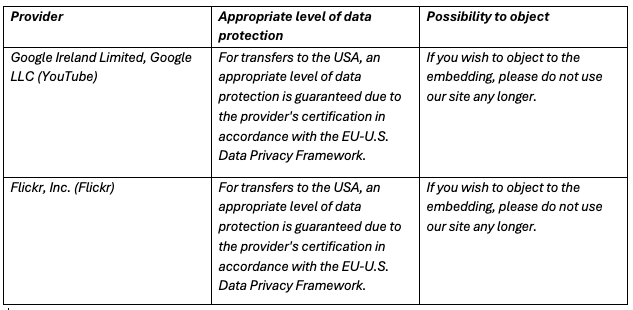 We embed videos and photos on our websites that are not stored on our own servers. When you access a page containing such videos and photos, content is loaded from the third-party provider that supplies them. Consequently, the third-party provider receives information that you have accessed our page, along with the usage data that is technically necessary in this context.